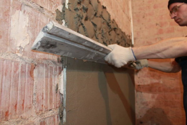 Оштукатуривание кирпичной стены начинают с заполнения швов, а уже потом приступают к общему нанесению.