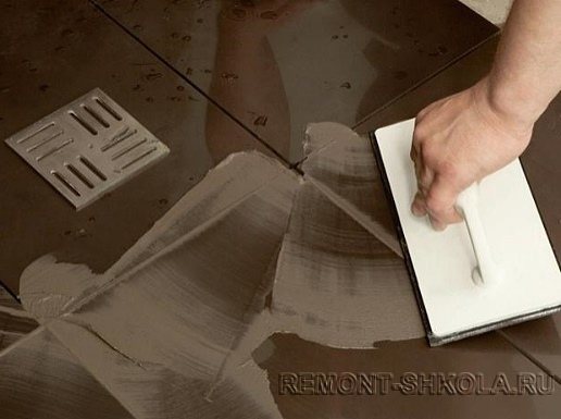 Затирка межплиточных швов половой плитки с помощью строительной тёрки.